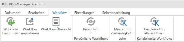 In dieser Ansicht sind alle persönlichen und Kanzleiweiten Workflows unabhängig der Zuständigkeit aufgelistet und dient der Übersicht. Im Menü des PDF-Managers werden nur folgende Workflows angezeigt: Persönliche, Kanzleiweite und Workflows für die Sie „zuständig“ sind. Falls Ihnen ein Workflow nicht angezeigt wird können Sie ihn in der Übersicht finden (dann fehlt Ihnen die Zuständigkeit).