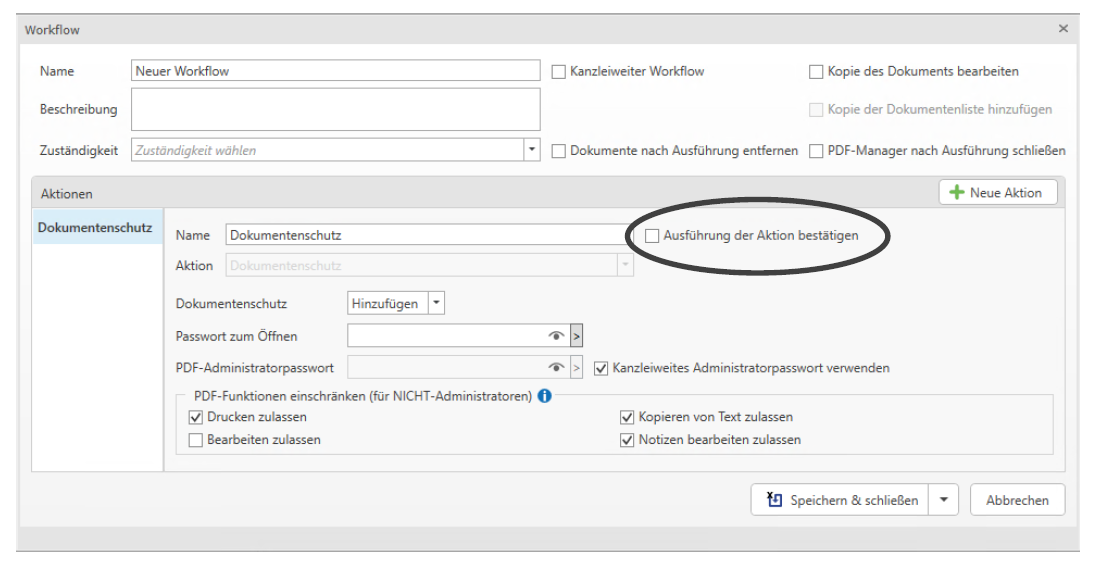 Diese Aktion bewirkt, dass einem PDF-Dokument automatisch ein Dokumentenschutz (mit den hier festgelegte/angehakten Einstellungen) hinzugefügt wird oder dieser entfernt wird.
