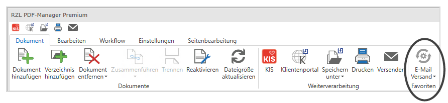 Wenn Sie die Option Zu Favoriten hinzufügen wählen, wird dieser Workflow auf der Startleiste des RZL PDF-Managers (Registerblatt Dokument) angezeigt und kann auch gleich von dort gestartet werden.